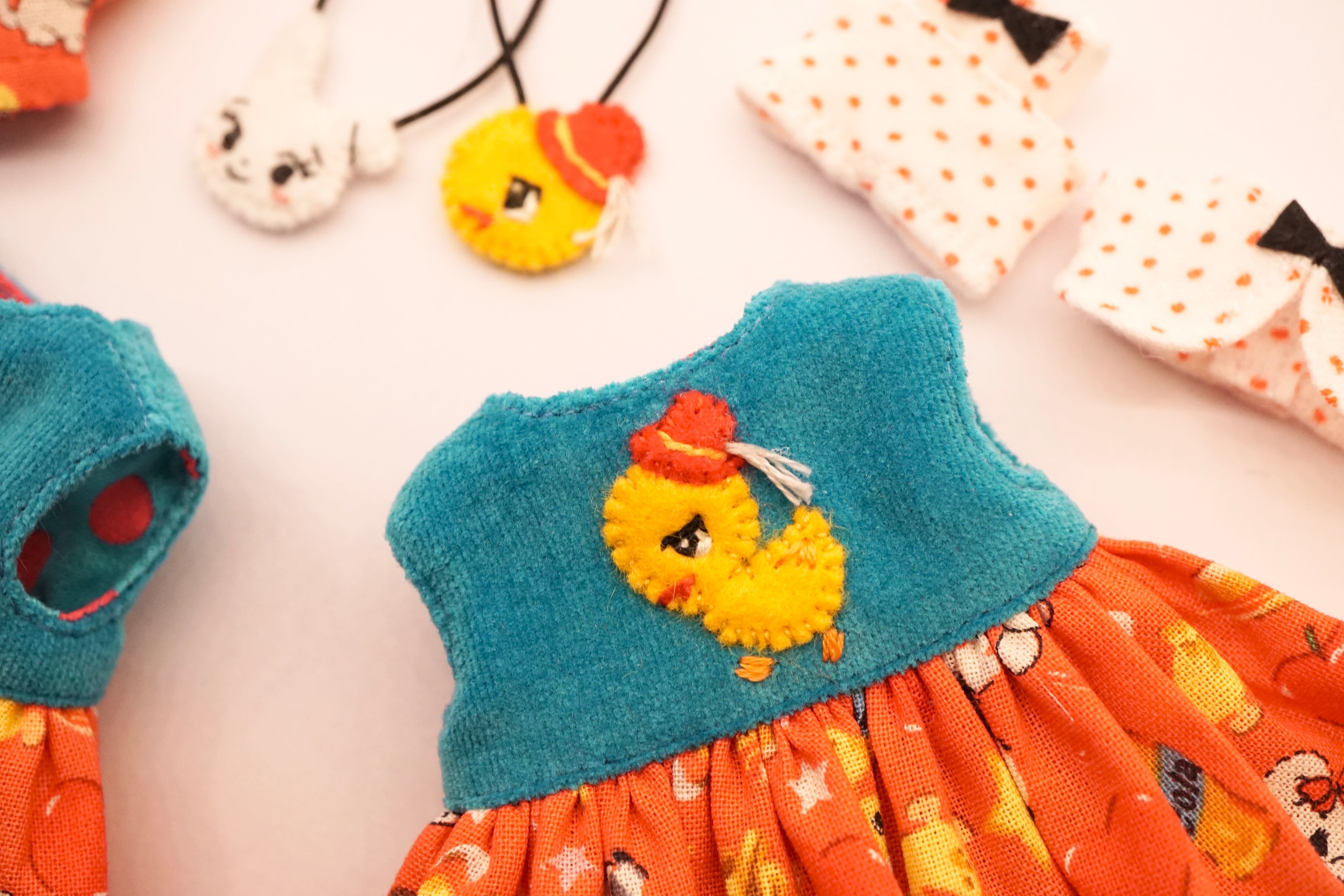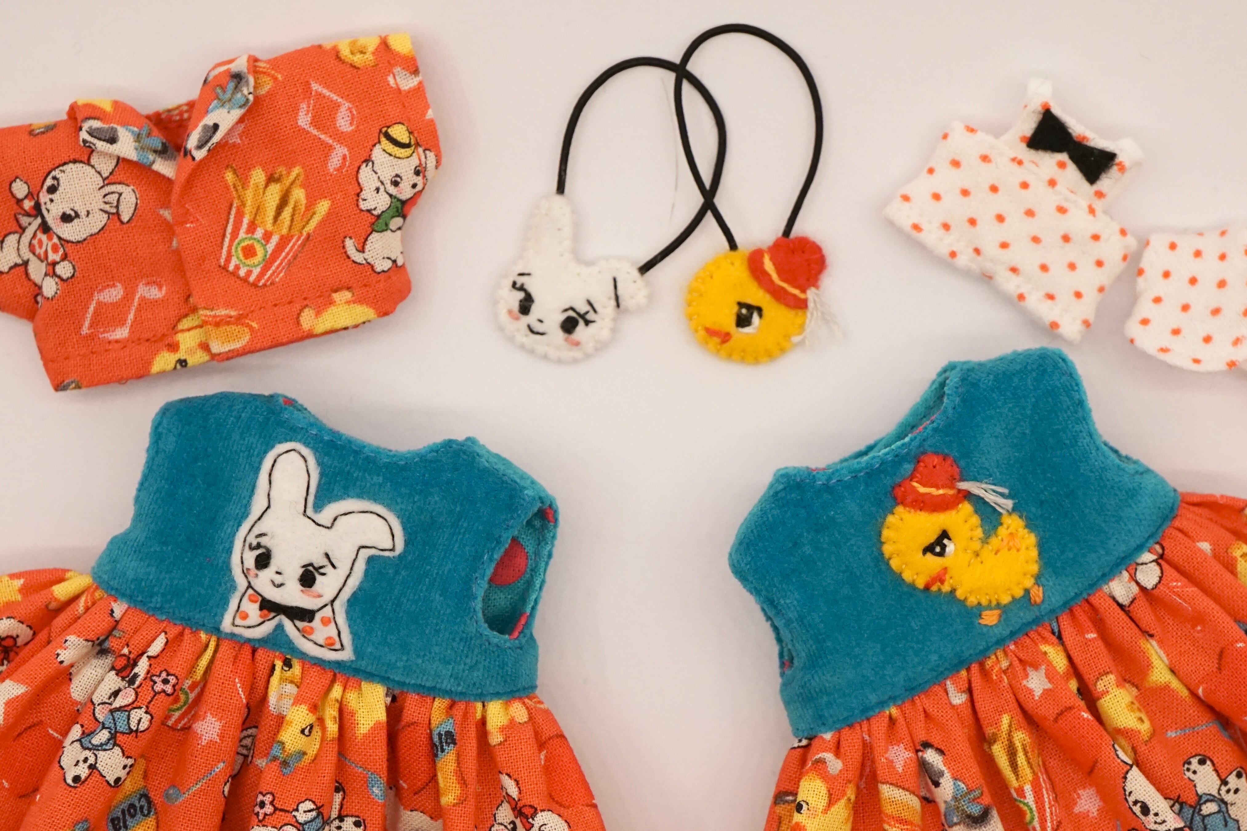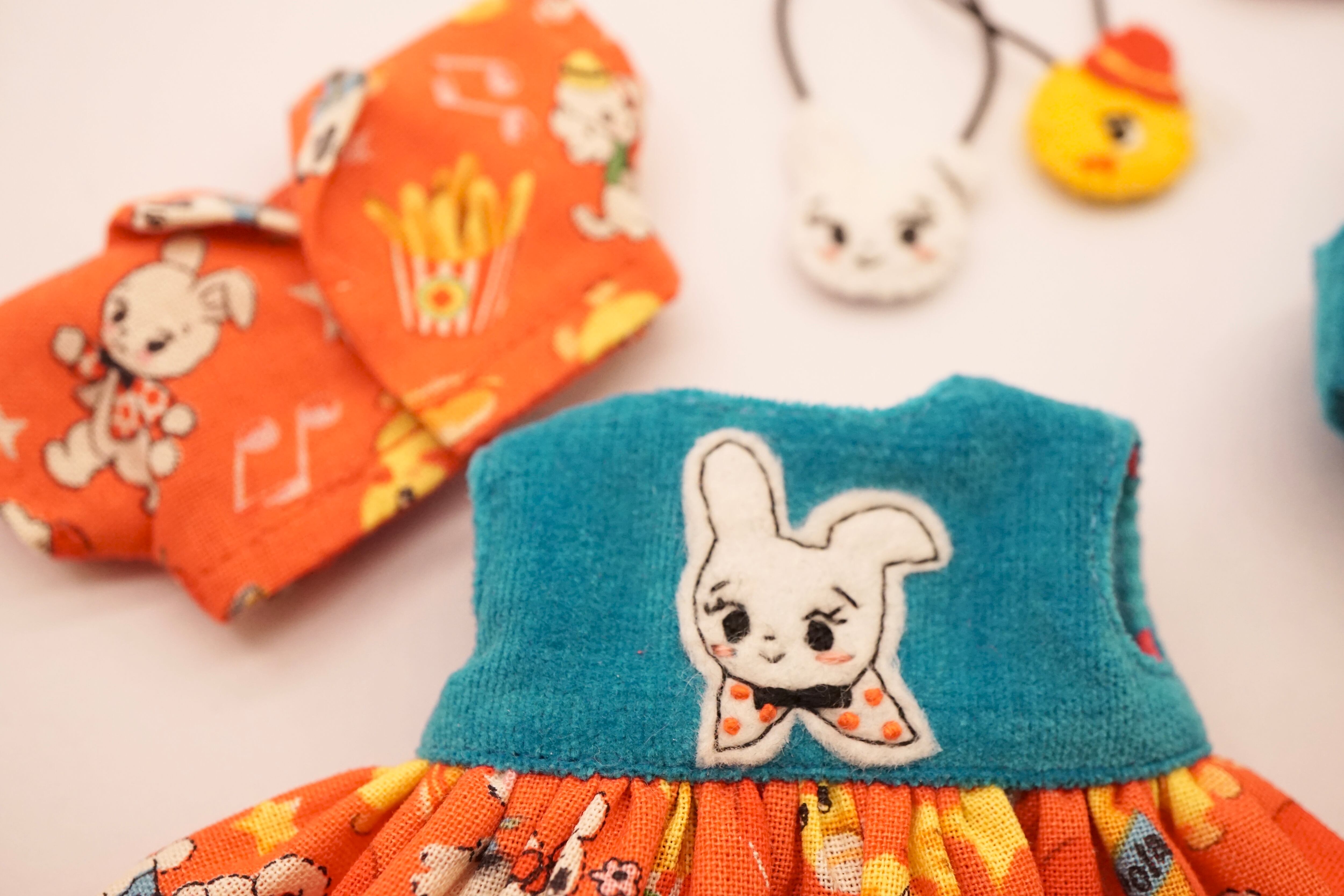 レトロうさぎとひよこをフェルトだアップリケしてます。